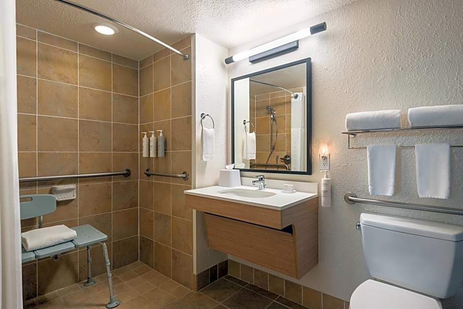 This room features a 42-inch flat-screen cable TV with high-definition channels, microwave, and small refrigerator. The private bathroom has a roll-in shower.